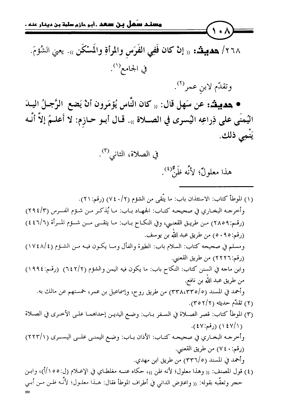 (٣) الموطأ كتاب: قصر الصلاة في السفر باب: وضع اليدين إحداهما على الأخرى في الصلاة (١/ ١٤٧) (رقم: ٤٧).