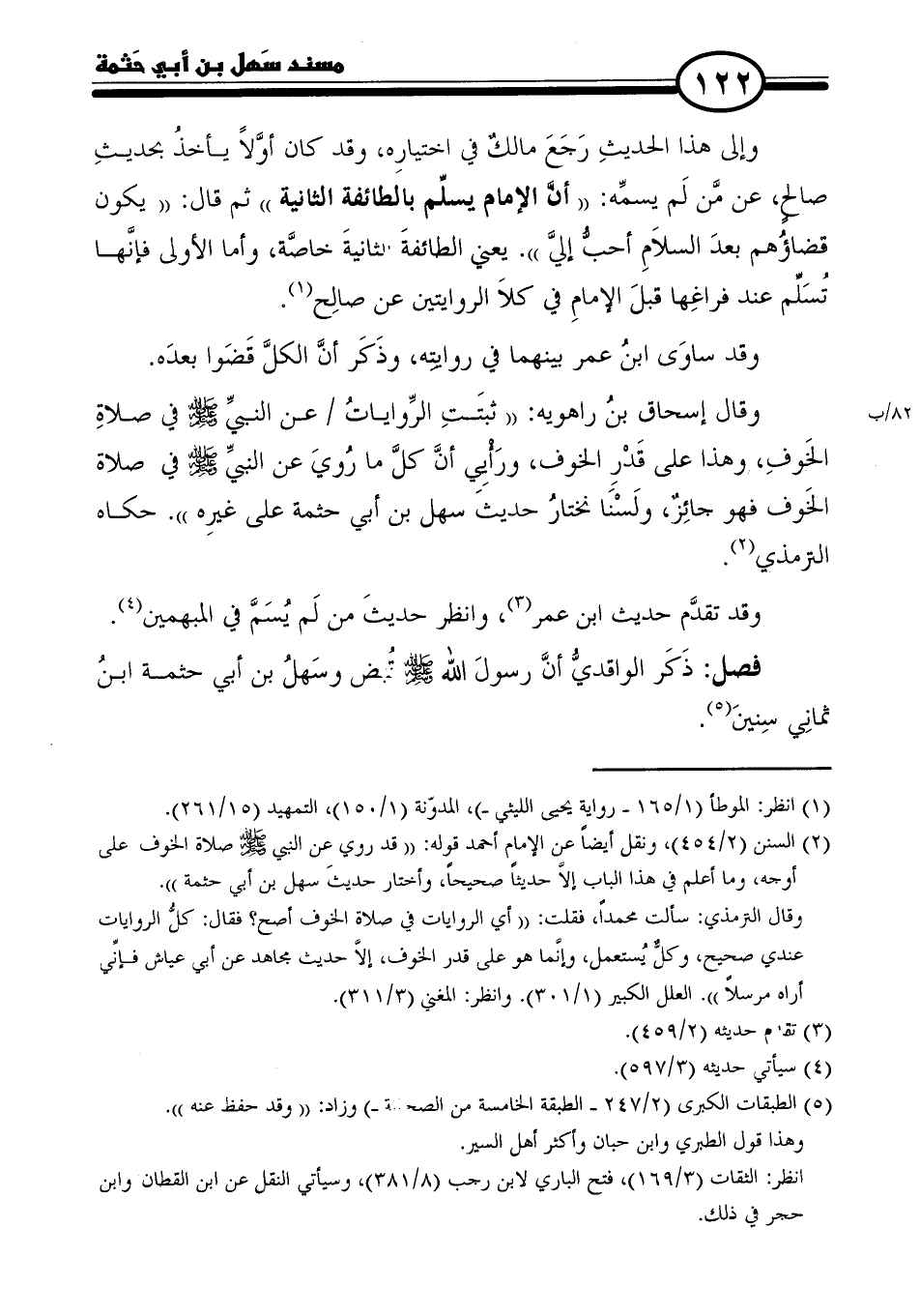 (٢) السنن (٢/ ٤٥٤)، ونقل أيضًا عن الإمام أحمد قوله: "قد روي عن النبي - صلى الله عليه وسلم - صلاة الخوف على أوجه، وما أعلم فِي هذا الباب إلاَّ حديثًا صحيحًا، وأختار حديثَ سهل بن أبي حثمة".