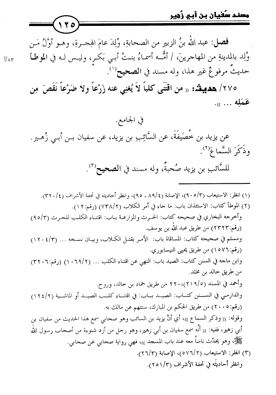٢٧٥ /حديث: "من اقتَنَى كلبًا لاَ يُغنِي عنه زَرْعًا ولا ضَرْعًا نَقَصَ مِن عَمَلِه ... ".