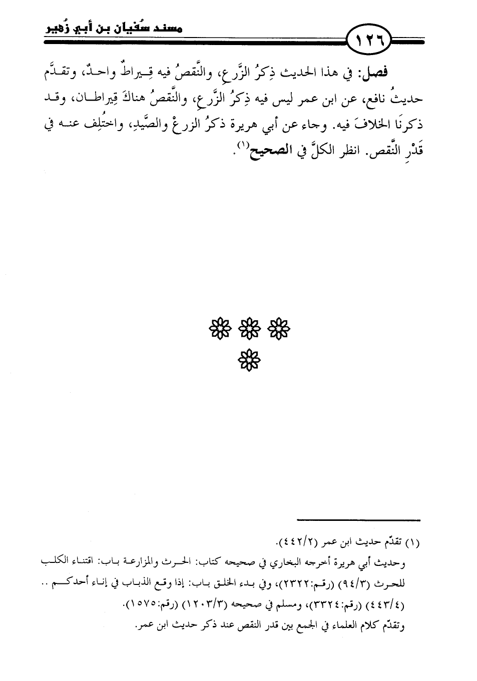فصل: في هذا الحديث ذِكرُ الزَّرع، والنَّقصُ فيه قِيراطٌ واحدٌ، وتقدَّم حديثُ نافع، عن ابن عمر ليس فيه ذِكرُ الزَّرعِ، والنَّقصُ هناكَ قِيراطان، وقد ذكرنَا الخلافَ فيه. وجاء عن أبي هريرة ذكرُ الزرع والصَّيدِ، واختُلِف عنه في قَدْرِ النَّقص. انظر الكلَّ في الصحيح (١).