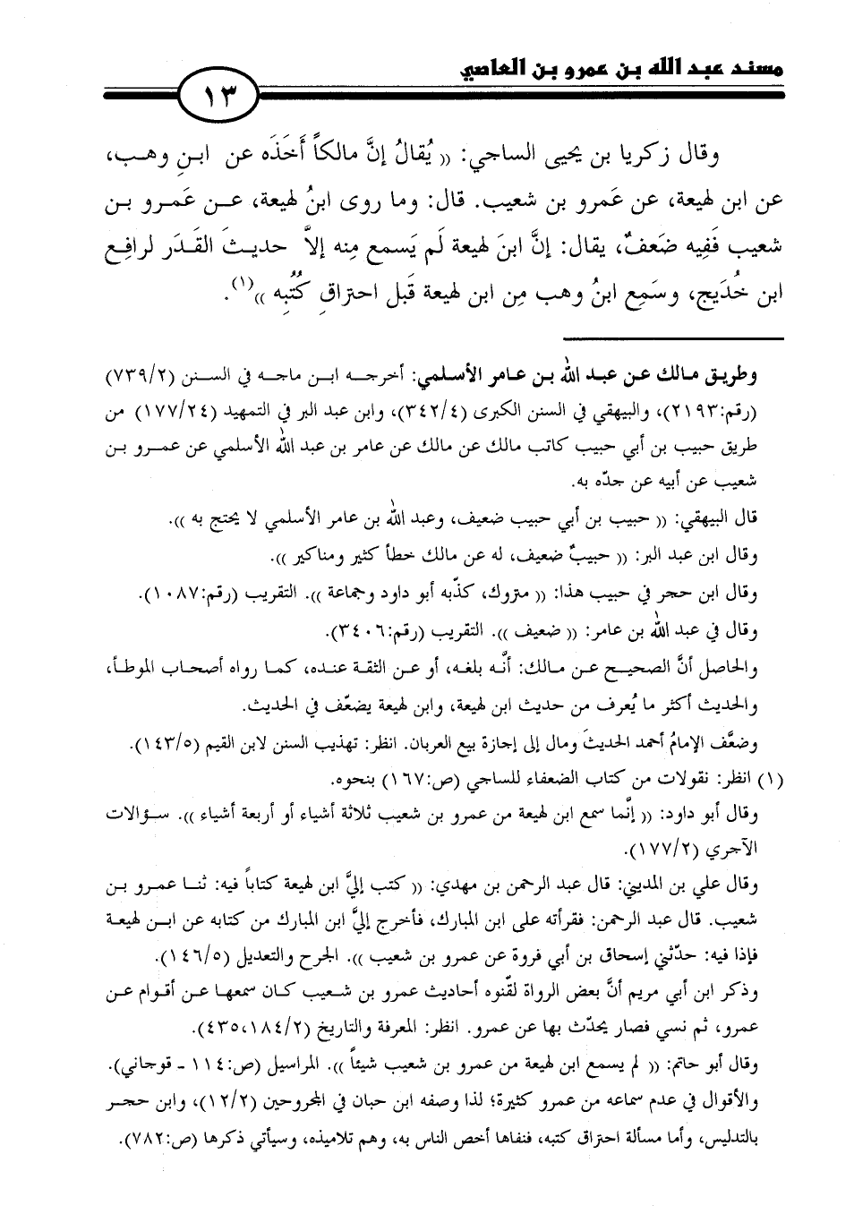 وقال زكريا بن يحيى الساجي: "يُقالُ إنَّ مالكًا أَخَذَه عن ابنِ وهب، عن ابن لهيعة، عن عَمرو بن شعيمب. قال: وما روي ابنُ لهيعة، عن عَمرو بن شعيب فَفِيه ضَعفٌ, يقال: إنَّ ابنَ لهيعة لَم يَسمع مِنه إلَّا حديثَ القَدَر لرافِع بن خدَيج، وسَمِع ابنُ وهب مِق ابن لهيعة قَبل احتراقِ كُتُبِه" (١).