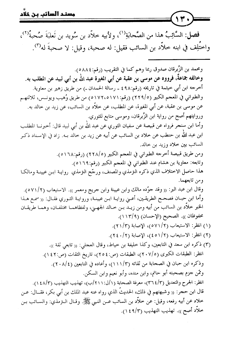 فصل: السَّائِبُ هذا من الصَّحابَةِ (١)، ولأبيه خلاّد بن سُويد بن ثَعلبَةَ صُحبةٌ (٢) واختُلِف في ابنه خلاّد بن السائب فقيل: له صحبة، وقيل: لا صحبةَ له (٣).