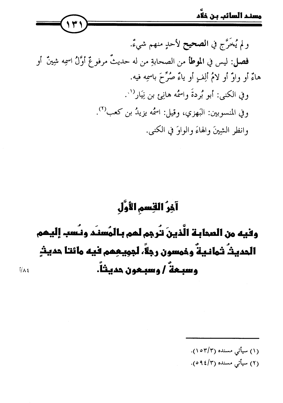 وفيه من الصحابة الَّذين تُرجم لهم بالمُسنَد ونُسب إليهم الحديث ثمانيةٌ وخمسون رجلًا، لجمِيعِهم فيه مائتا حديثٍ وسبعةٌ وسبعون حديثًا.