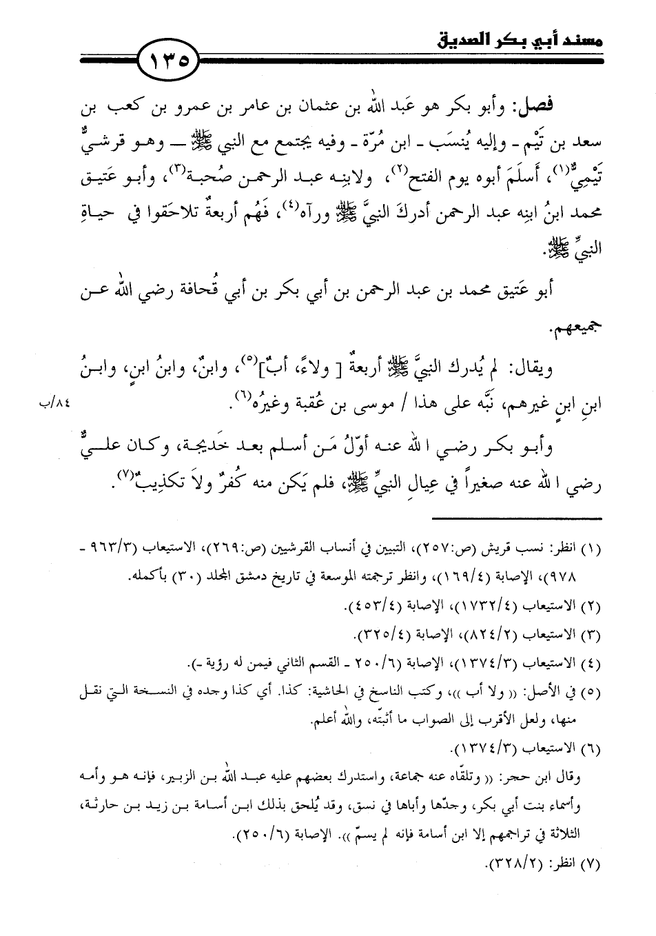 فصل: وأبو بكر هو عَبد الله بن عثمان بن عامر بن عمرو بن كعب بن سعد بن تَيْم -وإليه يُنسَب- ابن مُرّة -وفيه يجتمع مع النبي - صلى الله عليه وسلم - وهو قرشيٌّ تَيْمِيٌّ (١)، أَسلَمَ أبوه يوم الفتح (٢)، ولابنِه عبد الرحمن صُحبة (٣)، وأبو عَتيق محمد ابنُ ابنِه عبد الرحمن أدركَ النبيَّ - صلى الله عليه وسلم - ورآه (٤)، فَهُم أربعةٌ تلاحَقوا في حياةِ النبيِّ - صلى الله عليه وسلم -.