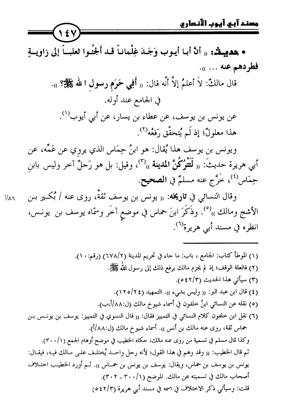وقال النسائي في تاريخ: "يونس بن يوسف ثقةٌ، روى عنه بكير بن الأشج ومالك" (٥). وذَكَرَ ابنَ حماس في موضع آخَر وسمّاه يوسف بن يونس، انظره في مسند أبي هريرة (٦).