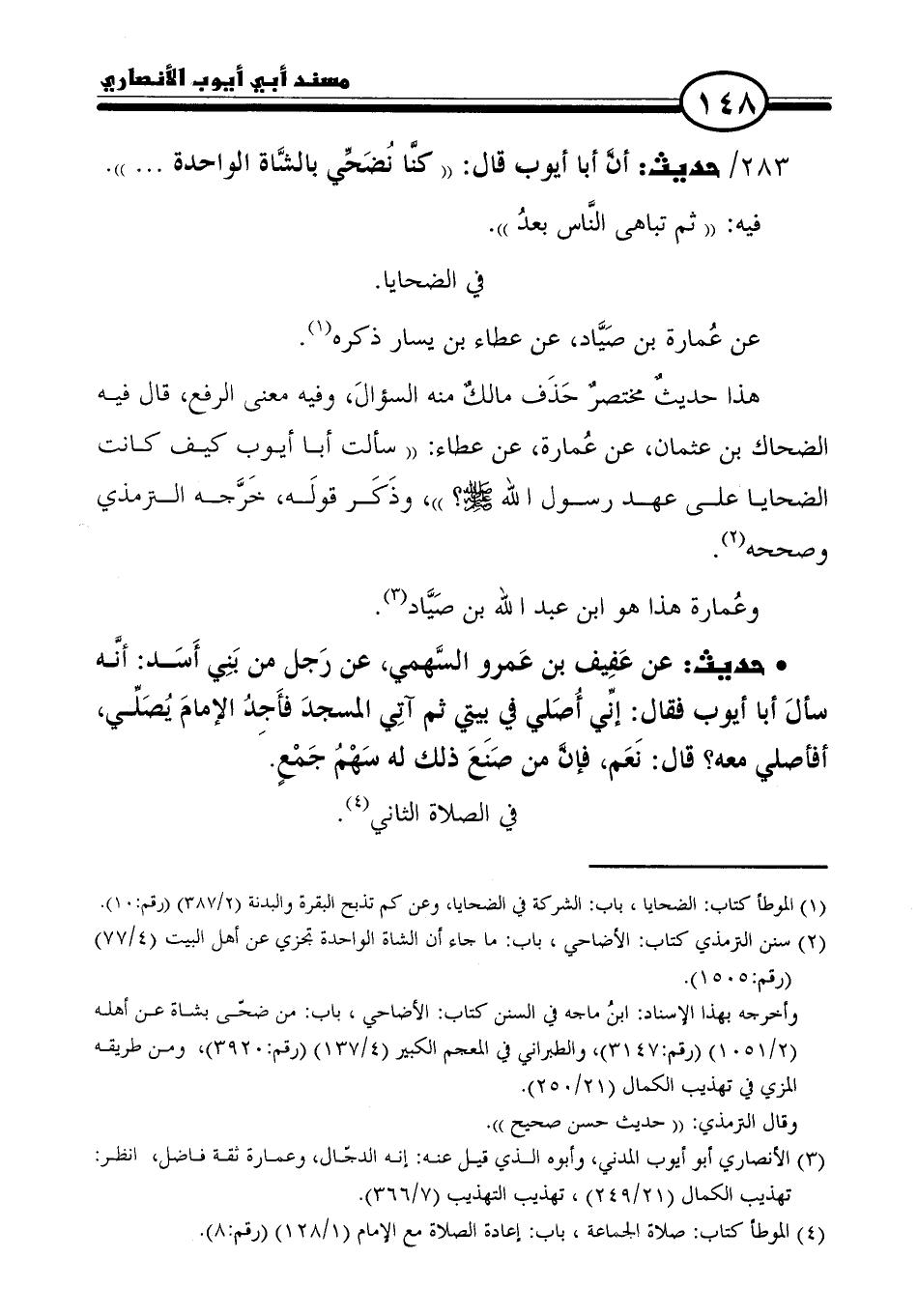 ٢٨٣/ حديث: أنَّ أبا أيوب قال: "كنَّا نُضَحِّي بالشَّاة الواحدة .. ".