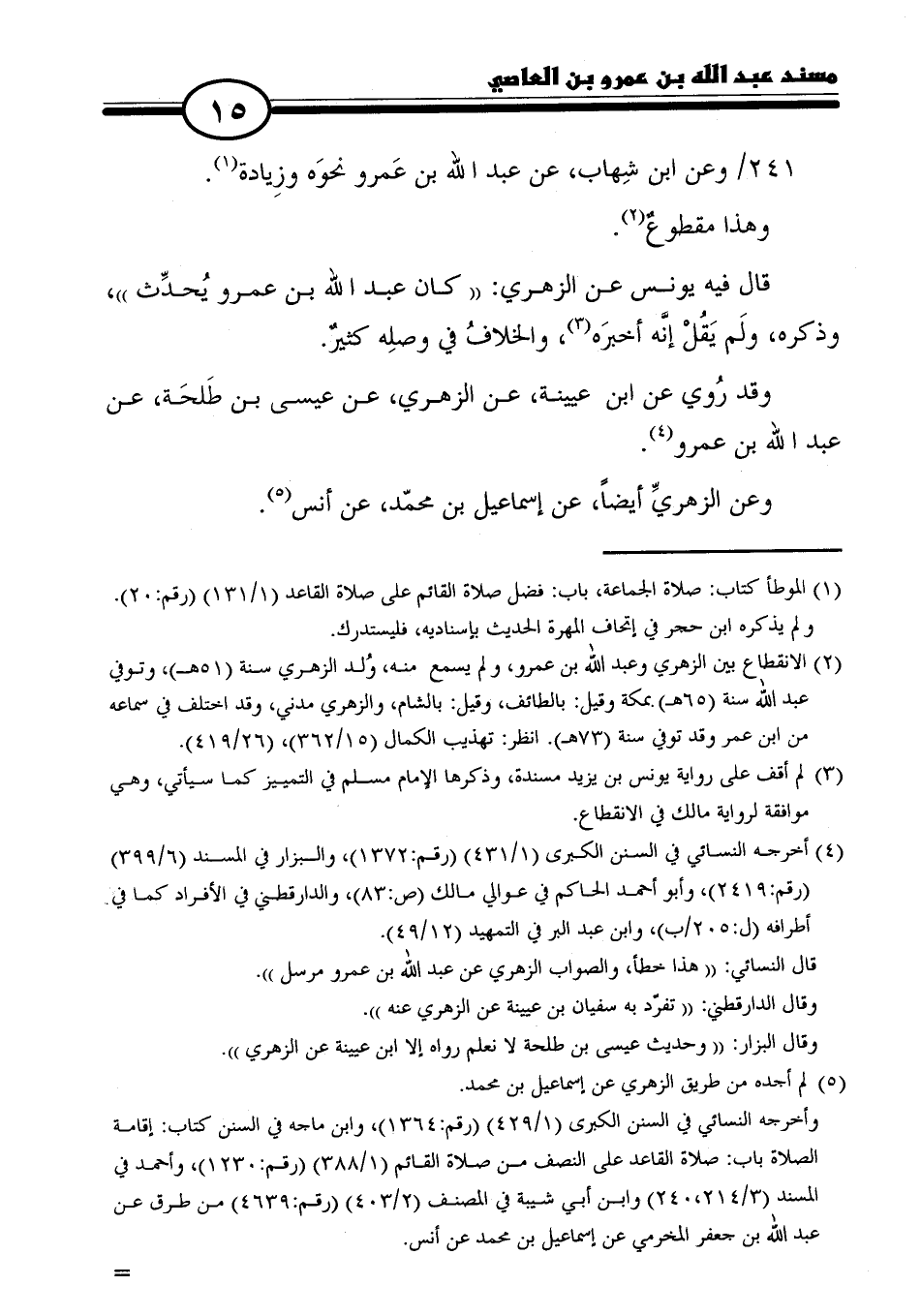 (٢) الانقطاع بين الزهري وعبد الله بن عمرو، ولم يسمع منه، وُلد الزهري سنة (٥١ هـ)، وتوفي عبد الله سنة (٦٥ هـ) بمكة وقيل: بالطائف، وقيل: بالشام، والزهري مدني، وقد اختلف في سماعه من ابن عمر وقد توفي سنة (٧٣ هـ). انظر: تهذيب الكمال (١٥/ ٣٦٢)، (٢٦/ ٤١٩).