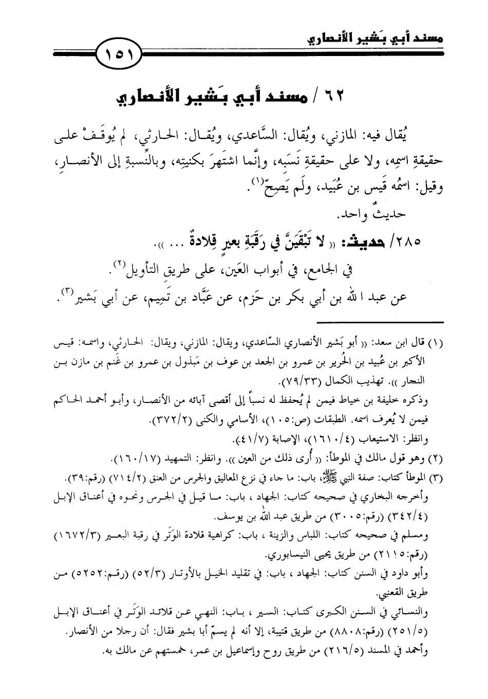 (١) قال ابن سعد: "أبو بَشير الأنصاري السّاعدي، ويقال: المازني، ويقال: الحارثي، وإسمه: قيس الأكبر بن عُبيد بن الحُرير بن عمرو بن الجعد بن عوف بن مَبذول بن عمرو بن غنم بن مازن بن النجار". تهذيب الكمال (٣٣/ ٧٩).