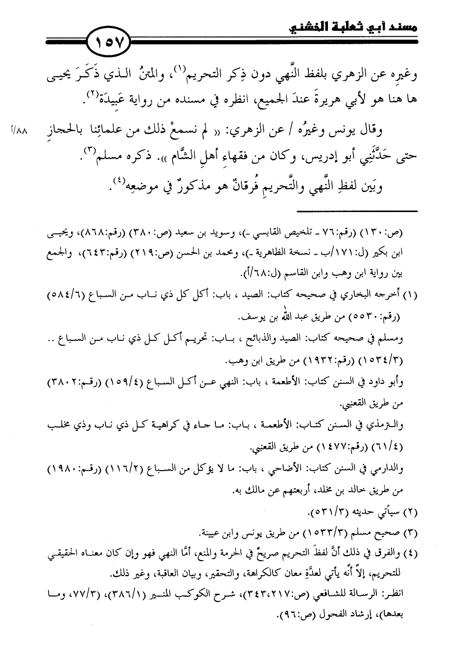 ومسلم في صحيحه كتاب: الصيد والذبائح، باب: تحريم أكل كل ذي ناب من السباع .. (٣/ ١٥٣٤) رقم: ١٩٣٢) من طريق ابن وهب.