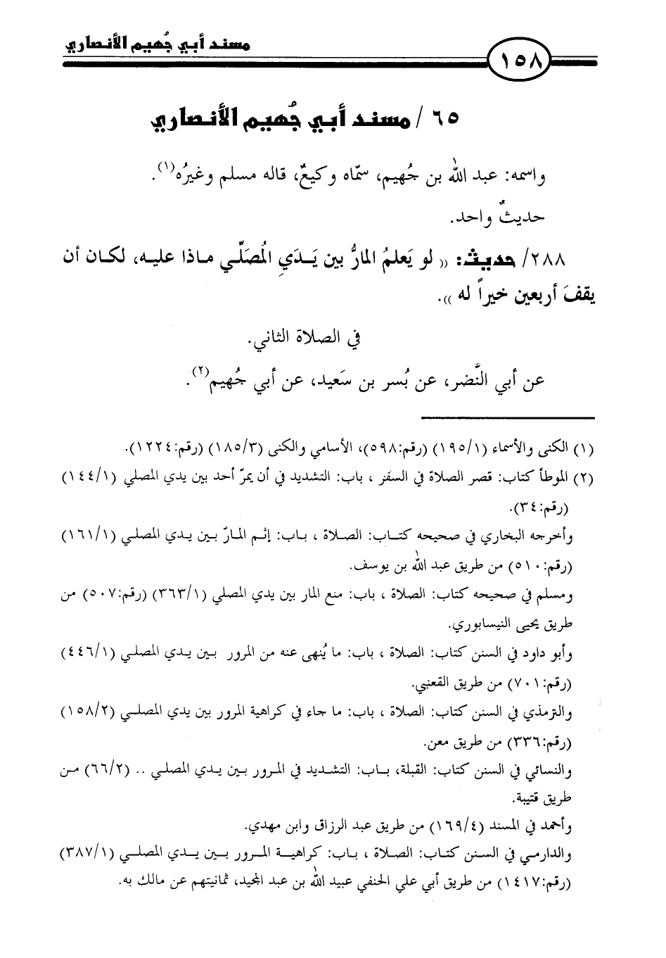 ٢٨٨/ حديث: "لو يَعلمُ المارُّ بين يَدَيِ المُصَلِّي ماذا عليه، لكان أن يقفَ أربعين خيرًا له".