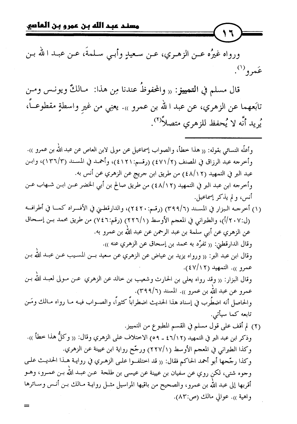 قال مسلم في التمييز: "والمحفوظُ عندنا مِن هذا: مالكٌ ويونس ومن تابَعهما عن الزهري، عن عبد الله بن عمرو". يعنِي من غيرِ واسطةٍ مقطوعًا، يُريد أنَّه لا يُحفظ للزهري متصلًا (٢).