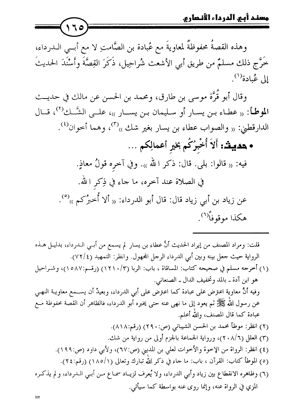 = قلت: ومراد المصنف من إيراد الحديث أنَّ عطاء بن يسار لم يسمع من أبي الدرداء، بدليل هذه الرواية حيث جعل بينه وبين أبي الدرداء الرجل المجهول. وانظر: التمهيد (٤/ ٧٢).