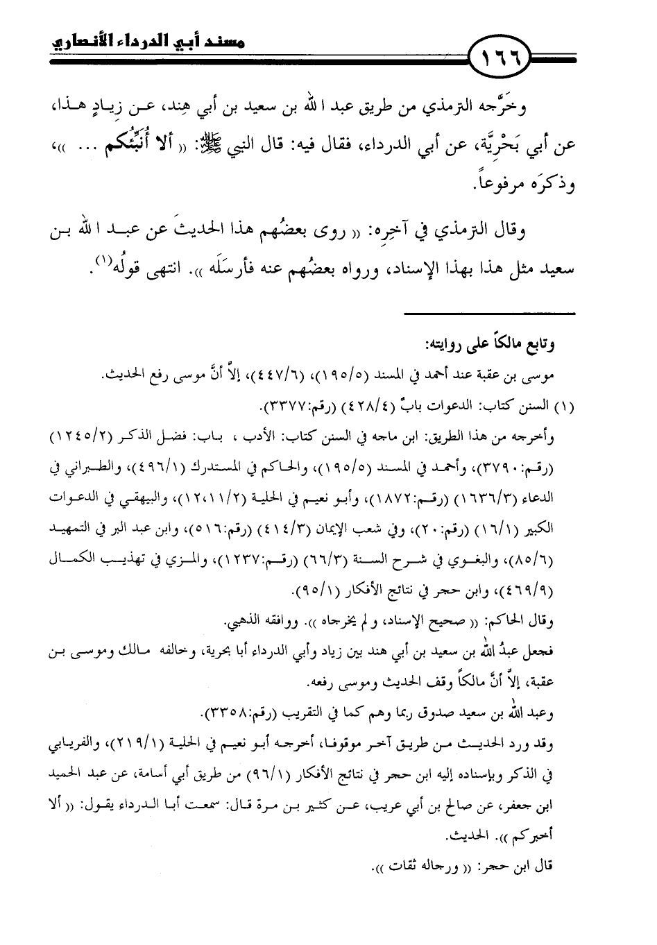 وأخرجه من هذا الطريق: ابن ماجه في السنن كتاب: الأدب، باب: فضل الذكر (٢/ ١٢٤٥) (رقم: ٣٧٩٠)، وأحمد في المسند (٥/ ١٩٥)، والحاكم في المستدرك (١/ ٤٩٦)، والطبراني في الدعاء (٣/ ١٦٣٦) (رقم: ١٨٧٢)، وأبو نعيم في الحلية (٢/ ١١، ١٢)، والبيهقي في الدعوات الكبير (١/ ١٦) (رقم: ٢٠)، وفي شعب الإيمان (٣/ ٤١٤) (رقم: ٥١٦)، وابن عبد البر في التمهيد (٦/ ٨٥)، والبغوي في شرح السنة (٣/ ٦٦) (رقم: ١٢٣٧)، والمزي في تهذيب الكمال (٩/ ٤٦٩)، وابن حجر في نتائج الأفكار (١/ ٩٥).