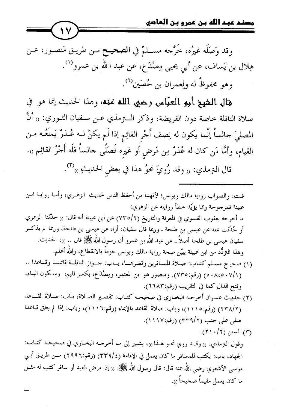 (٢) حديث عمران أخرجه البخاري في صحيحه كتاب: تقصير الصلاة، باب: صلاة القاعد (٢/ ٢٣٨) (رقم: ١١١٥)، وباب: صلاة القاعد بالإيماء (رقم: ١١١٦)، وباب: إذا لم يطق قاعدا صلي علي جنب (٢/ ٣٣٩) (رقم: ١١١٧).