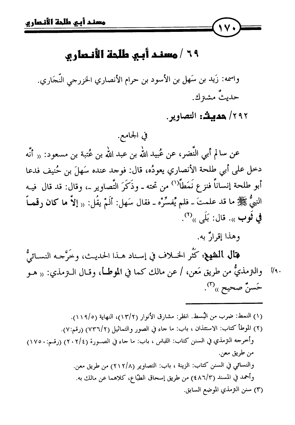 عن سالم أبي النَّضر، عن عُبيد الله بن عبد الله بن عُتبة بن مسعود: "أنَّه دخل على أبي طلحة الأنصاري يعودُه، قال: فوجد عنده سَهلَ بن حُنيف فدعا أبو طلحة إنسانًا فنزع نَمَطًا (١) من تحته- وذَكَرَ التَّصاوير-، وقال: قد قال فيه النبيُّ - صلى الله عليه وسلم - ما قد علمتَ -فلم يفسِّرْه- فقال سَهل: ألَمْ يقُل: "إلاَّ ما كان رقمًا في ثَوب". قال: بَلَى" (٢).