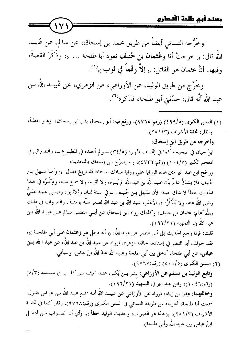وخَرَّجه النسائي أيضًا من طريق محمد بن إسحاق، عن سالم، عن عُيد الله قال: "خرجتُ أنا وعُثمان بن حُنيف نعود أبا طلحة ... "، وذَكَرَ القصةَ، وفيها: أنَّ عثمان هو القائل: "إلاَّ رقمًا في ثوب" (١).