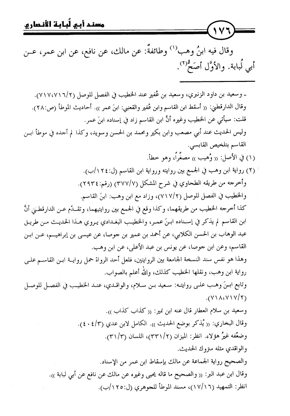 وقال فيه ابنُ وهب (١) وطائفة: عن مالك، عن نافع، عن ابن عمر، عن أبي لُبابة. والأوَّل أصَحُّ (٢).