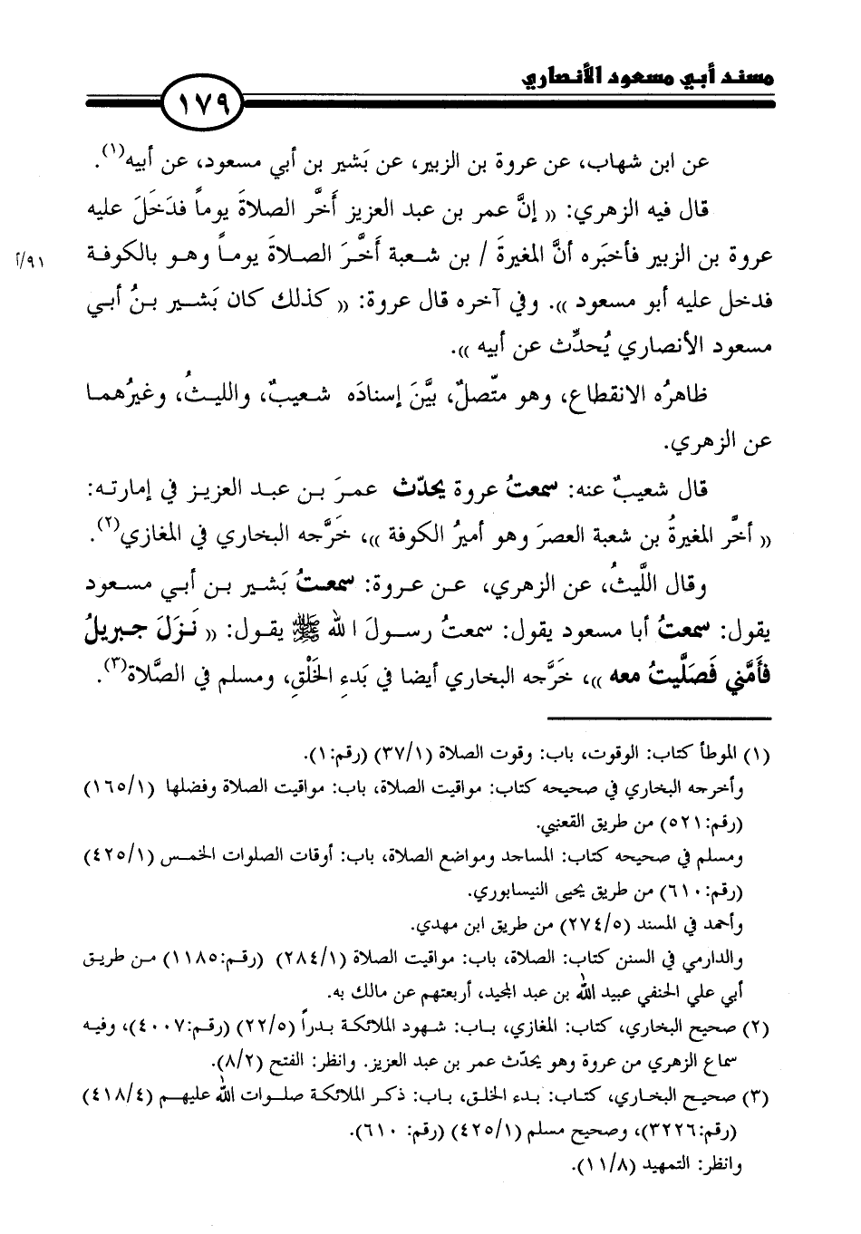 قال فيه الزهري: "إنَّ عمر بن عبد العزيز أَخَّر الصلاةَ يومًا فدَخَلَ عليه عروة بن الزبير فأخبَره أنَّ المغيرةَ ابن شعبة أَخَّرَ الصلاةَ يومًا وهو بالكوفة فدخل عليه أبو مسعود". وفي آخره قال عروة: "كذلك كان بَشير بنُ أبي مسعود الأنصاري يُحدّث عن أبيه".