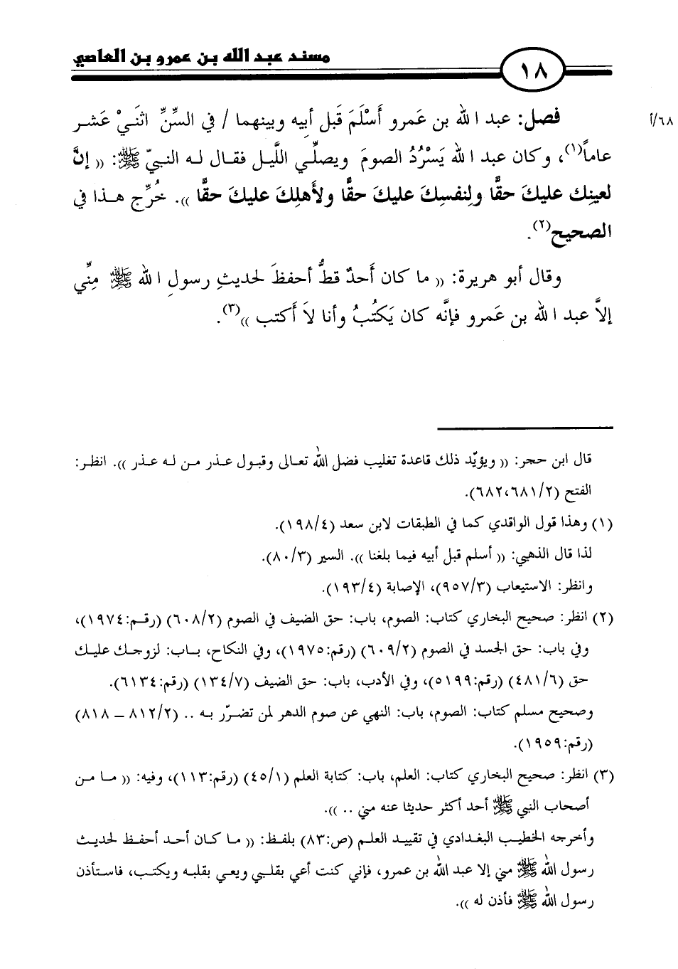 فصل: عبد الله بن عَمرو أَسْلَمَ قَبل أبِيه وبينهما في السِّنِّ اثنَيْ عَشر عامًا (١)، وكان عبد الله يَسْرُدُ الصومَ ويصلِّي اللَّيل فقال له النبيّ - صلى الله عليه وسلم -: "إنَّ لعينِك عليكَ حقًّا ولِنفسِكَ عليكَ حقًّا ولأَهلِكَ عليكَ حقًّا". خُرِّج هذا في الصحيح (٢).