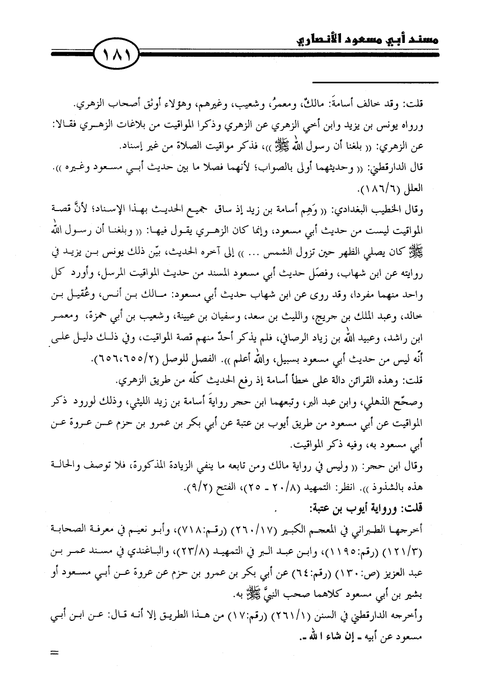 وصحّح الذهلي، وابن عبد البر، وتبعهما ابن حجر روايةَ أسامة بن زيد الليثي، وذلك لورود ذكر المواقيت عن أبي مسعود من طريق أيوب بن عتبة عن أبي بكر بن عمرو بن حزم عن عروة عن أبي مسعود به، وفيه ذكر المواقيت.
