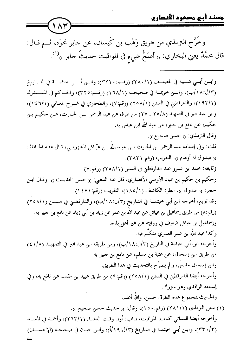 = وابن أبي شيبة في المصنف (١/ ٢٨٠) (رقم: ٣٢٢٠)، وابن أبي خيثمة في التاريخ (٣/ل: ١٨/ب)، وابن خزيمة في صحيحه (١/ ١٦٨) (رقم: ٣٢٥)، والحاكم في المستدركِ (١/ ١٩٣)، والدارقطني في السنن (١/ ٢٥٨) (رقم: ٧)، والطحاوي في شرح المعاني (١/ ١٤٦)، وابن عبد البر في التمهيد (٨/ ٢٥ - ٢٧) من طرق عن عبد الرحمن بن الحارث، عن حكيم بن حكيم، عن نافع بن جبير، عن عبد الله اين عباس به.