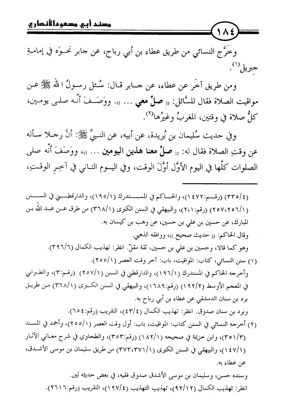 ومن طريق آخَر عن عطاء، عن جابر قال: سُئل رسولُ الله - صلى الله عليه وسلم - عن مواقيت الصلاة فقال للسَّائل: "صلِّ معي ... ". ووَصَفَ أنَّه صلى يومين، كلُّ صلاة يا وقتين، المغربُ وغيرُها (٢).