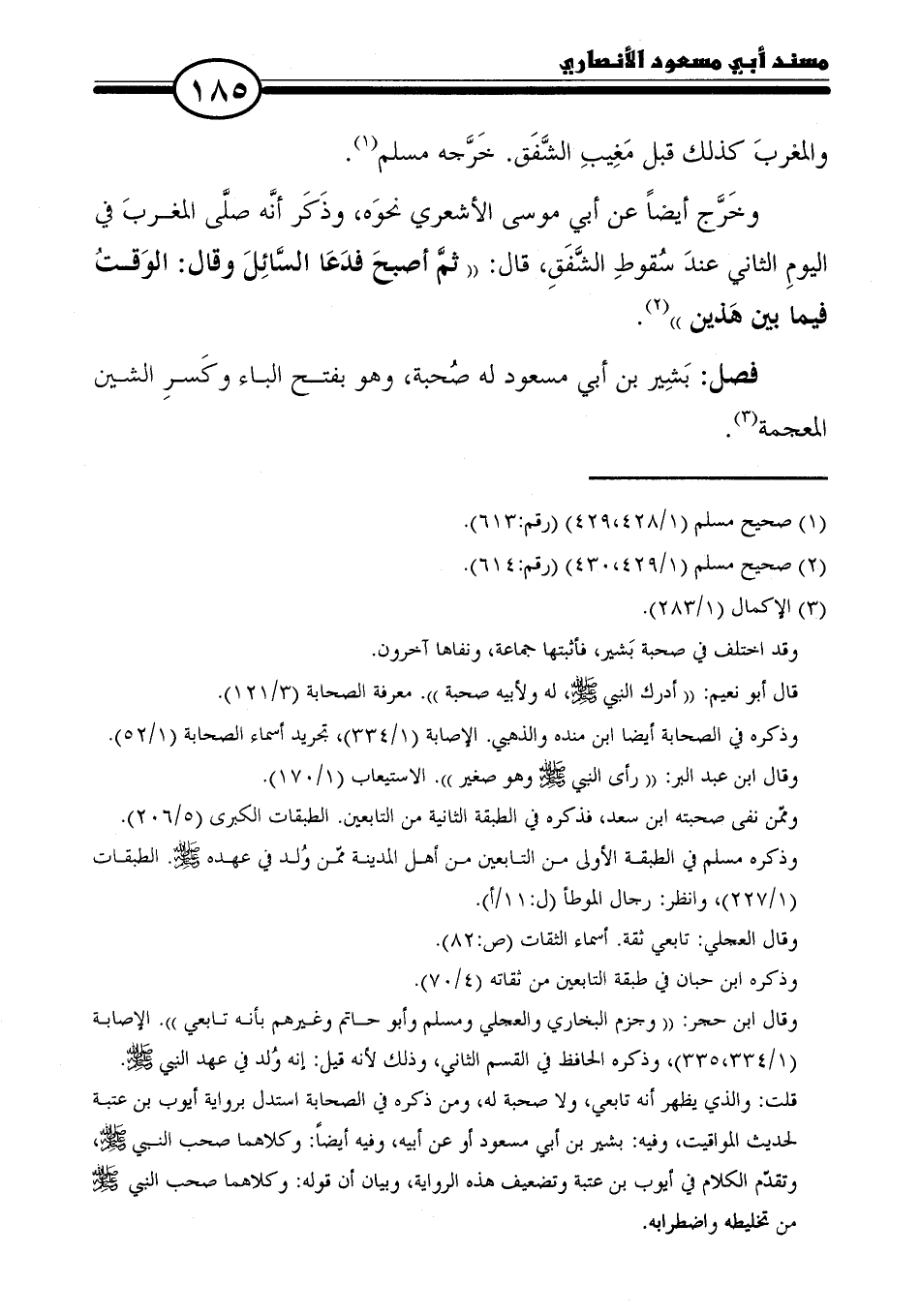 قلت: والذي يظهر أنه تابعي، ولا صحبة له، ومن ذكره في الصحابة استدل برواية أيوب بن عتبة لحديث المواقيت، وفيه: بشير بن أبي مسعود أو عن أبيه، وفيه أيضًا: وكلاهما صحب النبي - صلى الله عليه وسلم -، وتقدّم الكلام في أيوب بن عتبة وتضعيف هذه الرواية، وبيان أن قوله: وكلاهما صحب النبي - صلى الله عليه وسلم - من تخليطه واضطرابه.