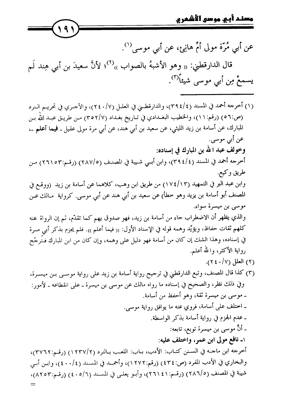 (١) أخرجه أحمد في المسند (٤/ ٣٩٤)، والدارقطني في العلل (٧/ ٢٤٠)، والآجري في تحريم النرد (ص: ٥٦) (رقم: ١١)، والخطيب البغدادي في تاريخ بغداد (٧/ ٣٥٢) من طريق عبد الله بن المبارك، عن أسامة بن زيد الليثي، عن سعيد بن أبي هند، عن أبي مرة مولى عقيل - فيما أعلم -، عن أبي موسى.