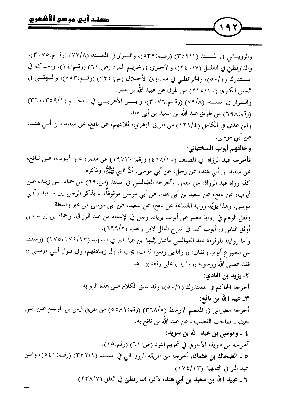 وأما روايته الموقوفة عند الطيالسي فأشار إليها ابن عبد البر في التمهيد (١٣/ ١٧٤، ١٧٥) (وسقط من المطبوع أيوب) فقال: "والذين رفعوه ثقات، يجب قبول زيادتهم، وفي قول أبي موسى" فقد عصى الله ورسوله" ما يدل على رفعه". اهـ.
