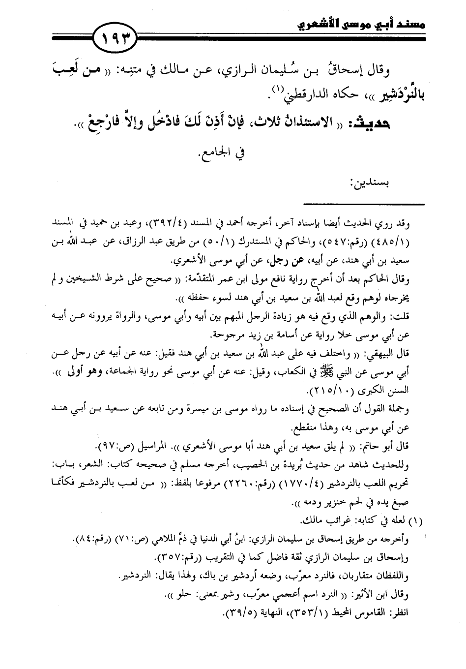 = وقد روي الحديث أيضا بإسناد آخر، أخرجه أحمد في المسند (٤/ ٣٩٢)، وعبد بن حميد في المسند (١/ ٤٨٥) (رقم: ٥٤٧)، والحاكم في المستدرك (١/ ٥٠) من طريق عبد الرزاق، عن عبد الله بن سعيد بن أبي هند، عن أبيه، عن رجل، عن أبي موسى الأشعري.