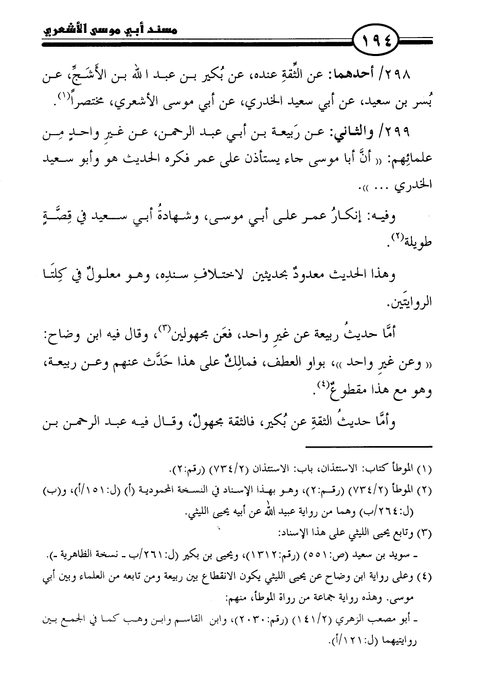 (٤) وعلى رواية ابن وضاح عن يحيى الليثي يكون الانقطاع بين ربيعة ومن تابعه من العلماء وبين أبي موسى. وهذه رواية جماعة من رواة الموطأ، منهم: