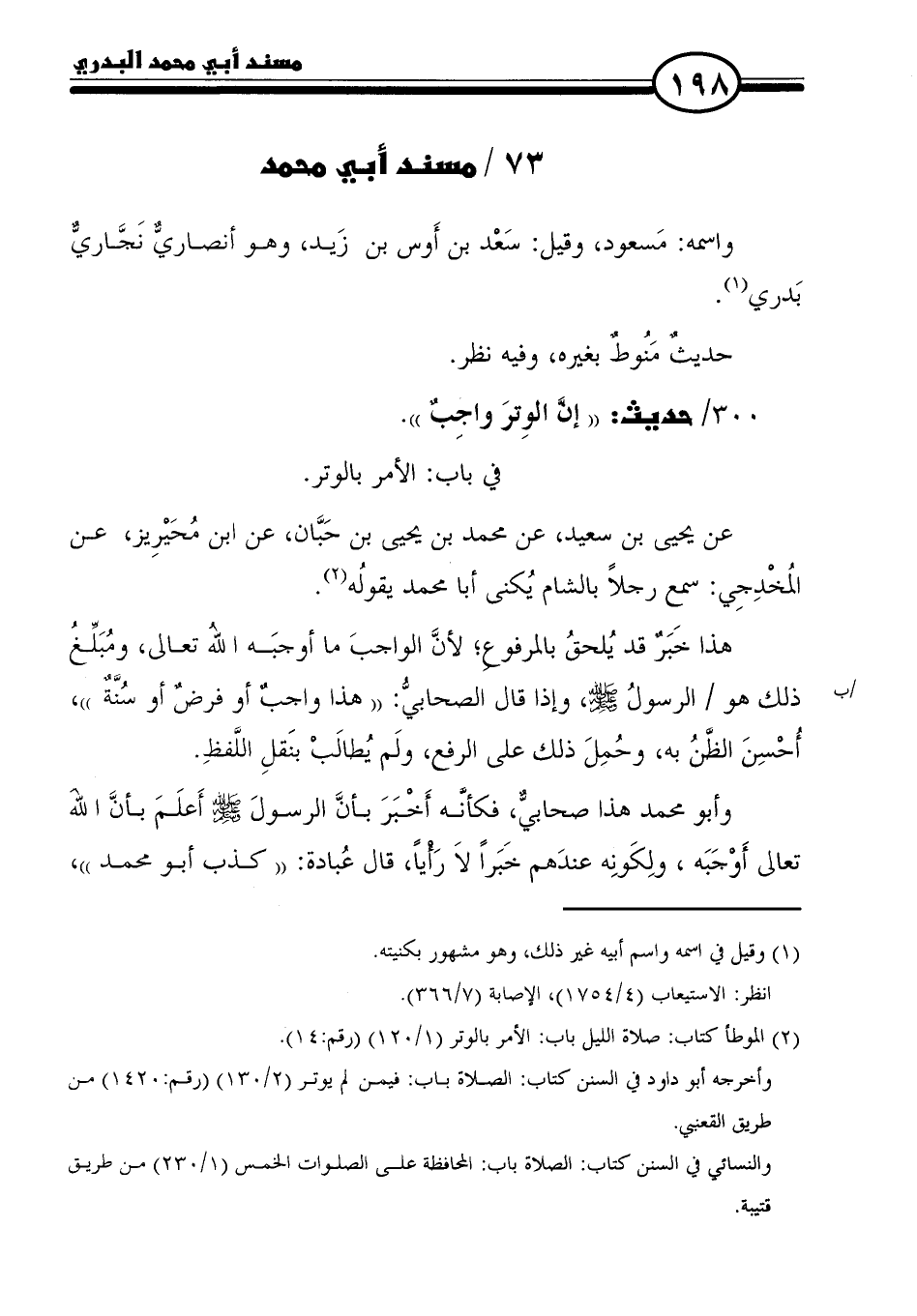 ٣٠٠/ حديث: "إنَّ الوِترَ واجِبٌ".