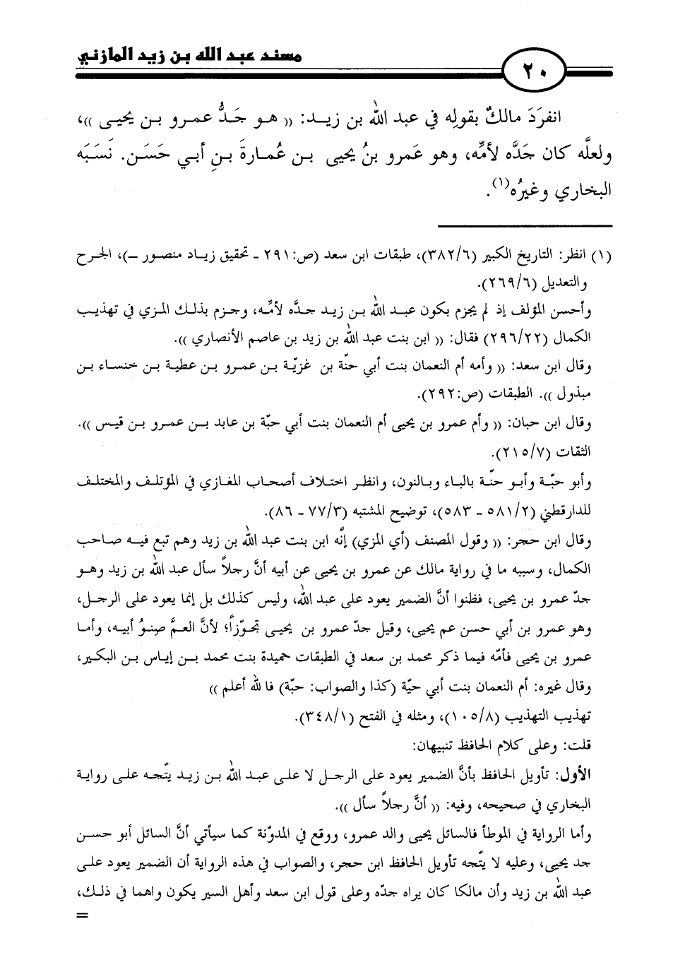 وأما الرواية في الموطأ فالسائل يحيى والد عمرو، ووقع في المدوّنة كما سيأتي أنَّ السائل أبو حسن جد يحيى، وعليه لا يتّجه تأويل الحافظ ابن حجر، والصواب في هذه الرواية أن الضمير يعود علي عبد الله بن زيد وأن مالكا كان يراه جدّه وعلي قول ابن سعد وأهل السير يكون واهما في ذلك، =
