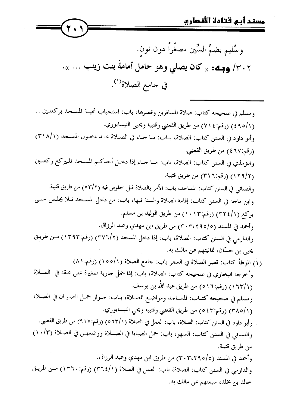 ٣٠٢ / وبه: "كان يصلي وهو حامل أمامةَ بنت زينب ... ".