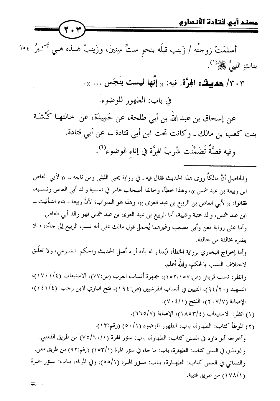 ٣٠٣ / حديث: الهِرَّة. فيه: "إنَّها ليست بنَجَس ... ".