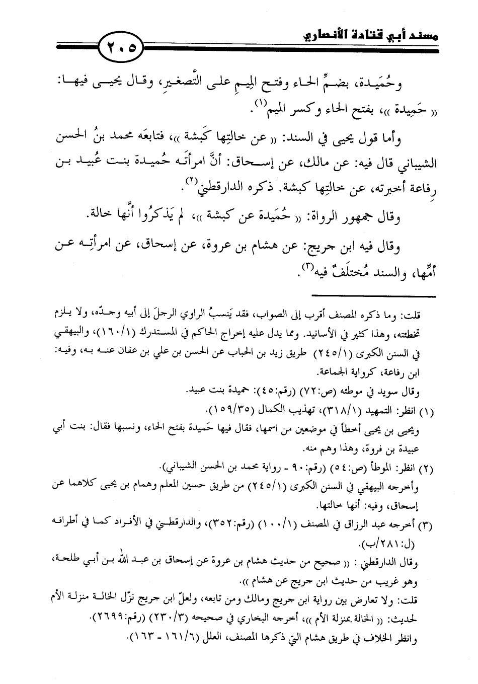 وأما قول يحيى في المسند: "عن خالتِها كَبشة"، فتابعَه محمد بنُ الحسن الشيباني قال فيه: عن مالك، عن إسحاق: أنَّ امرأتَه حُميدة بنت عُبيد بن رِفاعة أخبرته، عن خالتِها كبشة. ذكره الدارقطني (٢).