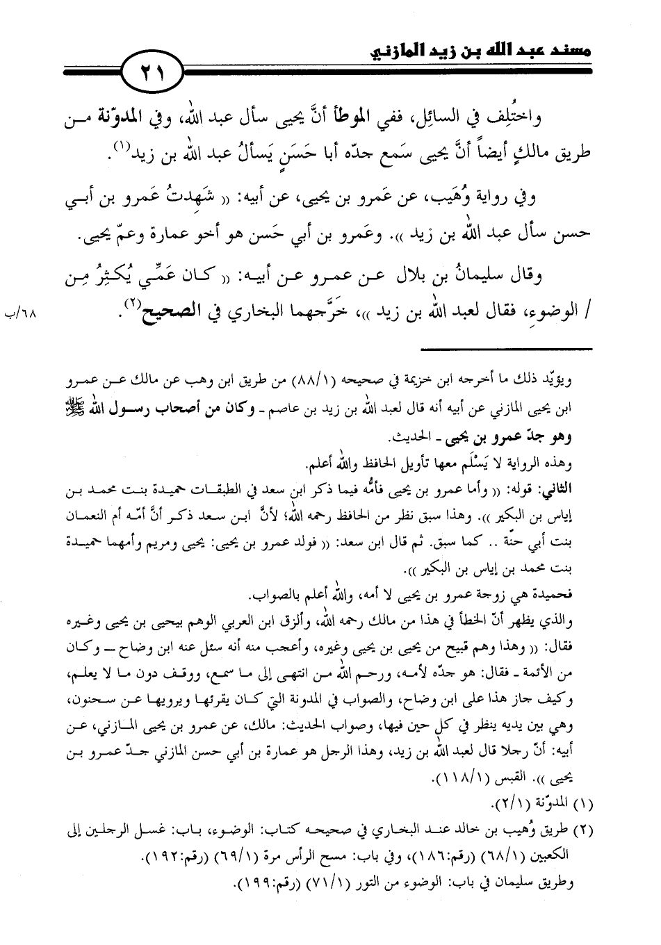= ويؤيّد ذلك ما أخرجه ابن خزيمة في صحيحه (١/ ٨٨) من طريق ابن وهب عن مالك عن عمرو بن يحيى المازني عن أبيه أنه قال لعبد الله بن زيد بن عاصم- وكان من أصحاب رسول الله وهو جدّ عمرو بن يحيى- الحديث.