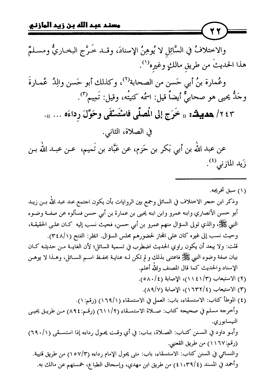 وذكر ابن حجر الاختلاف في السائل وجمع بين الروايات بأن يكون اجتمع عند عبد الله بن زيد أبو حسن الأنصاري وابنه عمرو وابن ابنه يحيى بن عمارة بن أبي حسن فسألوه عن صفة وضوء النبي - صلى الله عليه وسلم -، والذي تولي السؤال منهم عمرو بن أبي حسن، فحيث نسب إليه كان علي الحقيقة، وحيث نسب إلي غيره كان علي المجاز لحضورهم مجلس السؤال. انظر: الفتح (١/ ٣٤٨).