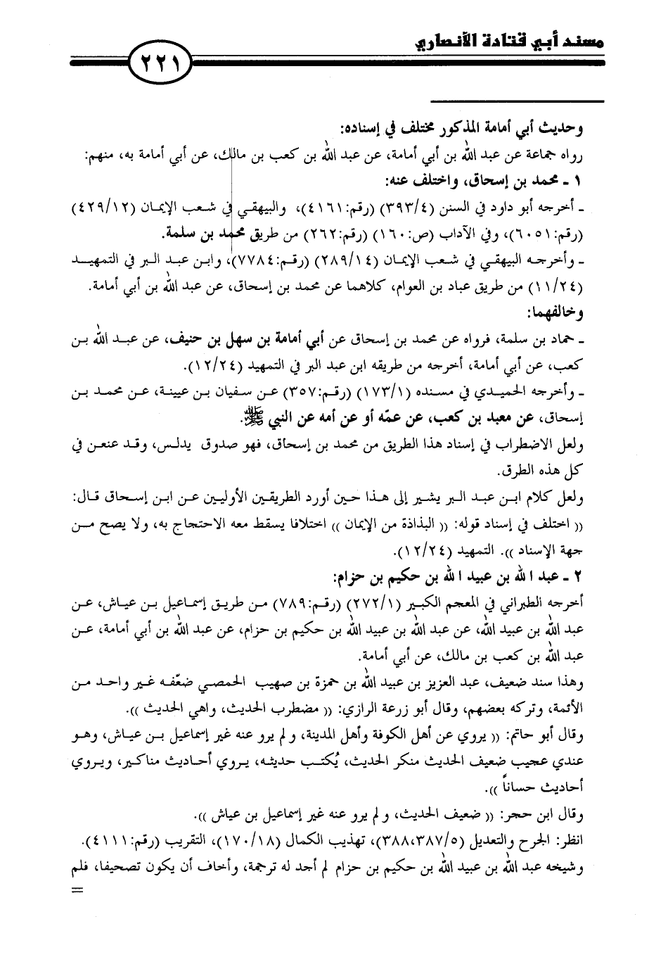 - حماد بن سلمة، فرواه عن محمد بن إسحاق عن أبي أمامة بن سهل بن حنيف، عن عبد الله بن كعب، عن أبي أمامة، أخرجه من طريقه ابن عبد البر في التمهيد (٢٤/ ١٢).