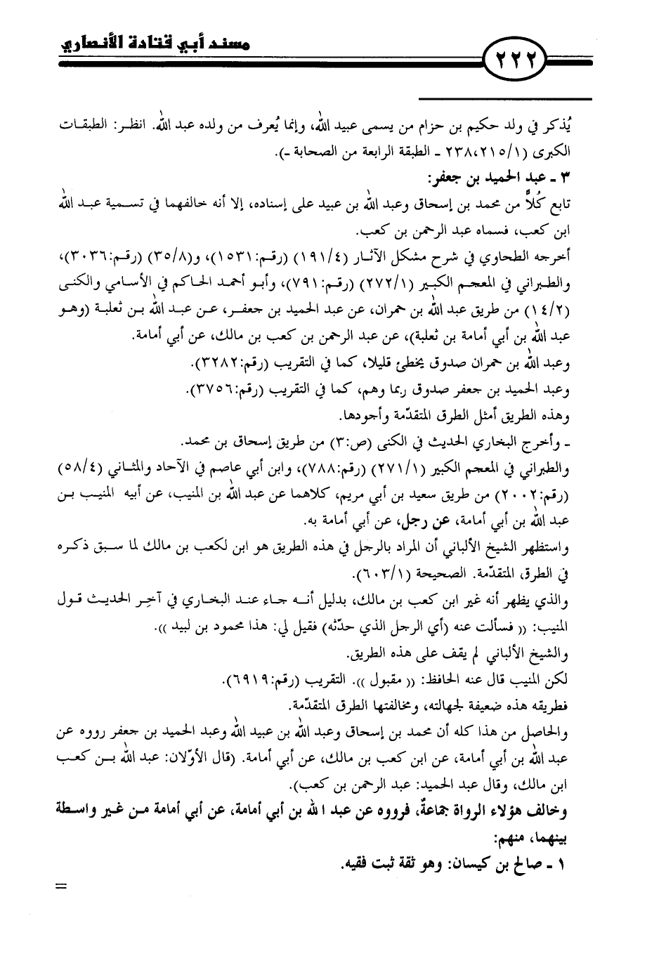 والحاصل من هذا كله أن محمد بن إسحاق وعبد الله بن عبيد الله وعبد الحميد بن جعفر رووه عن عبد الله بن أبي أمامة، عن ابن كعب بن مالك، عن أبي أمامة. (قال الأوّلان: عبد الله بن كعب بن مالك، وقال عبد الحميد: عبد الرحمن بن كعب).