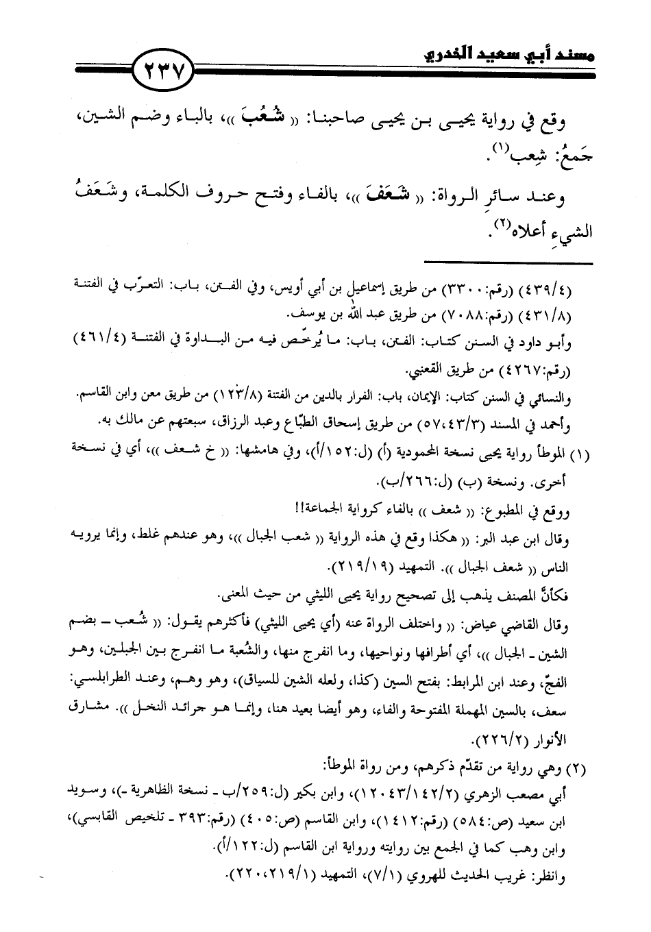 وقال القاضي عياض: "واختلف الرواة عنه (أي يحيى الليثي) فأكثرهم يقول: "شُعب - بضم الشين - الجبال، أي أطرافها ونواحيها، وما انفرج منها، والشُعبة ما انفرج بين الجبلين، وهو الفجَّ، وعند ابن المرابط: بفتح السين (كذا، ولعله الشين للسياق)، وهو وهم، وعند الطرابلسي: سعف، بالسين المهملة المفتوحة والفاء، وهو أيضا بعيد هنا، وإنما هو جرائد النخل. مشارق الأنوار (٢/ ٢٢٦).