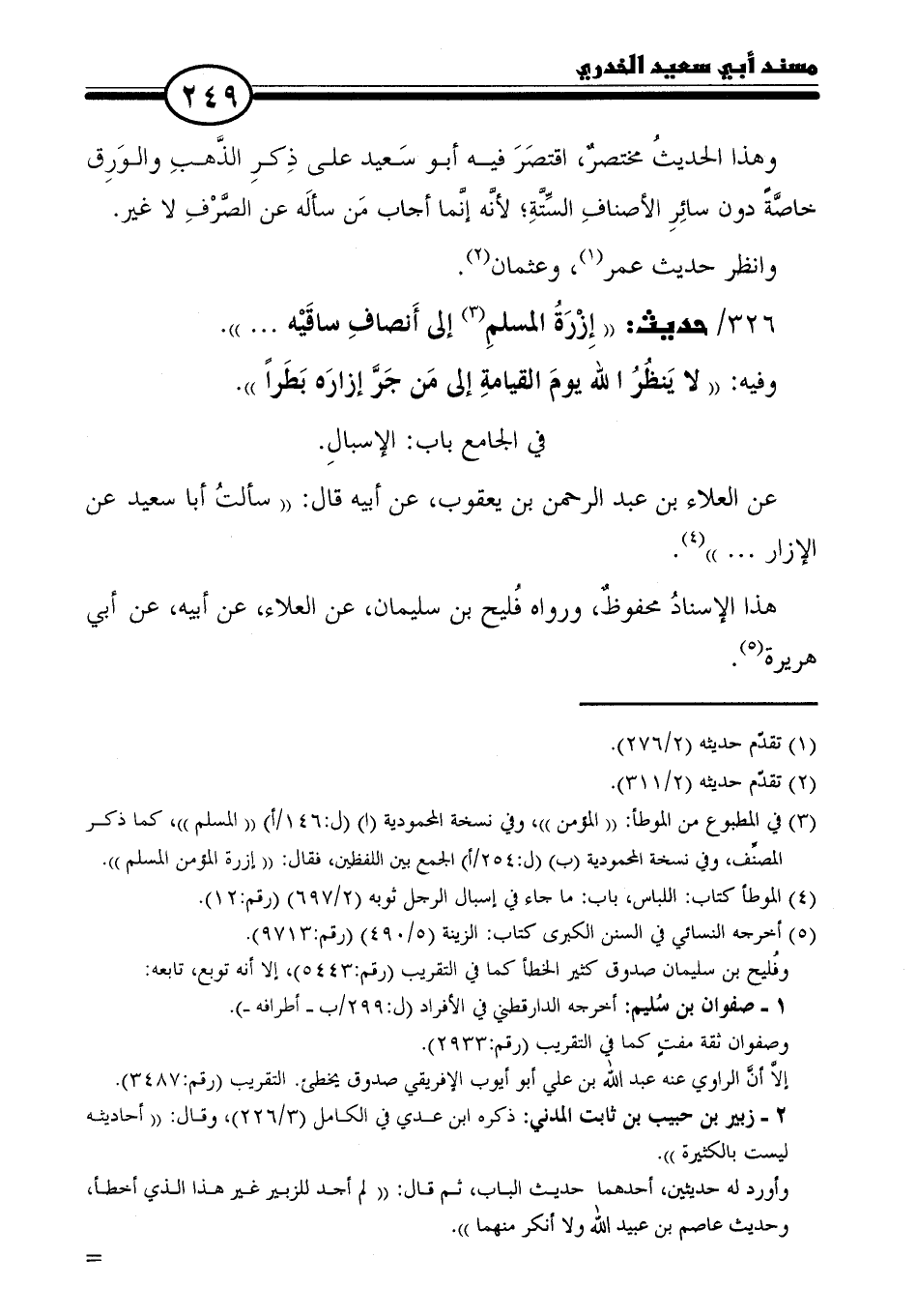 ٣٢٦/ حديث: "إِزرَة المسلمِ (٣) إلى أَنصافِ ساقَيْه ... ".