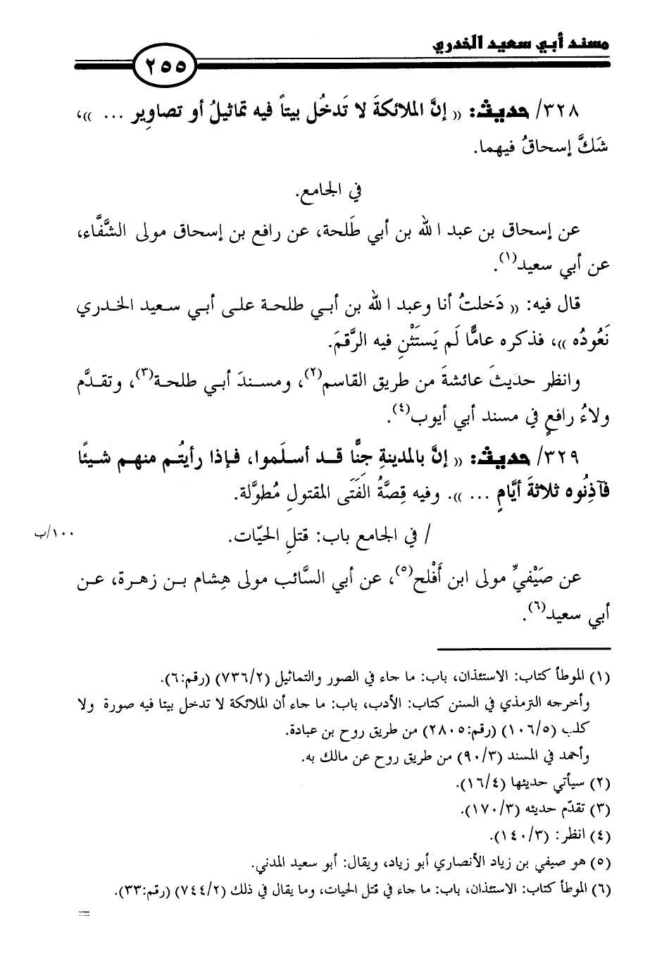 ٣٢٩ / حديث: "إنَّ بالمدينةِ جنًّا قد أسلَموا، فهاذا رأيتُم منهم شيئًا فآذِنُوه ثلاثةَ أيَّامٍ ... ". وفيه قِصَّةُ الَفَتَى المقتولِ مُطوَّلة.