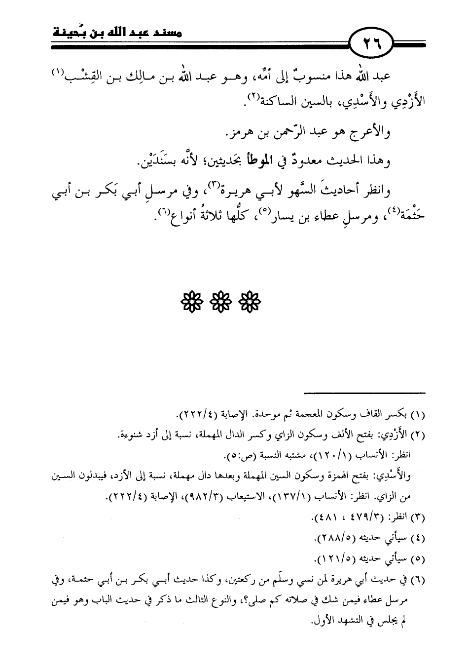 وانظر أحاديثَ السَّهو لأبي هريرة (٣)، وفي مرسلِ أبي بَكر بن أبي حَثْمَة (٤)، ومرسلِ عطاء بن يسار (٥)، كلُّها ثلاثةُ أنواع (٦).