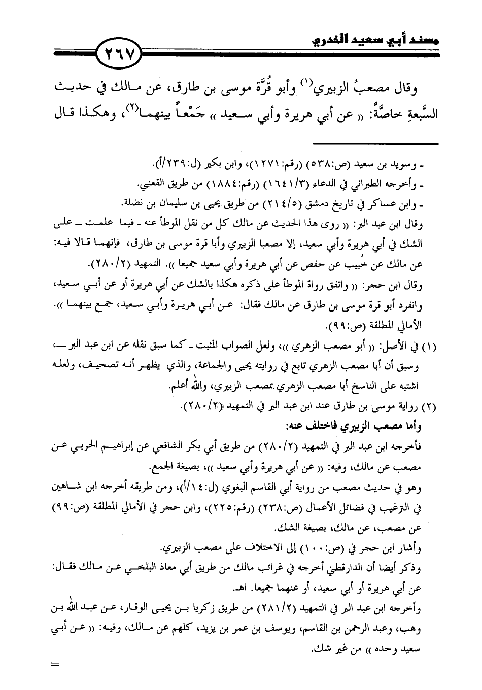 وقال ابن عبد البر: "روى هذا الحديث عن مالك كل من نقل الموطأ عنه - فيما علمت - على الشك في أبي هريرة وأبي سعيد، إلا مصعبا الزبيري وأبا قرة موسى بن طارق، فإنهما قالا فيه: عن مالك عن خُبيب عن حفص عن أبي هريرة وأبي سعيد جميعا". التمهيد (٢/ ٢٨٠).