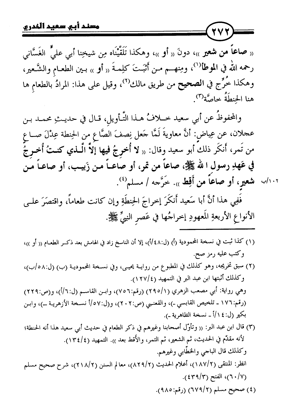 (٣) قال ابن عبد البر: "وتأوَّل أصحابنا وغيرهم في ذكر الطعام في حديث أبي سعيد هذا أنه الحنطة؛ لأنه مقدّم في الحديث، ثم الشعير، ثم التمر، والأَقط بعد". التمهيد (٤/ ١٣٤).
