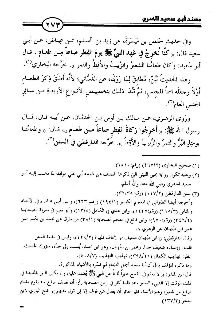 وفي حديثِ حَفص بن مَيسَرَةَ، عن زيد بن أسلم، عن عِياض، عن أبي سعيد قال: "كنَّا نُخرِجُ في عَهد النَّبِيِّ - صلى الله عليه وسلم - يومَ الفِطر صاعًا مِن طعام، قال أبو سَعيد: وكان طعامُنا الشعيرُ والزَّبيبُ والأَقِطُ والتمر. خَرَّجه البخاري (١).