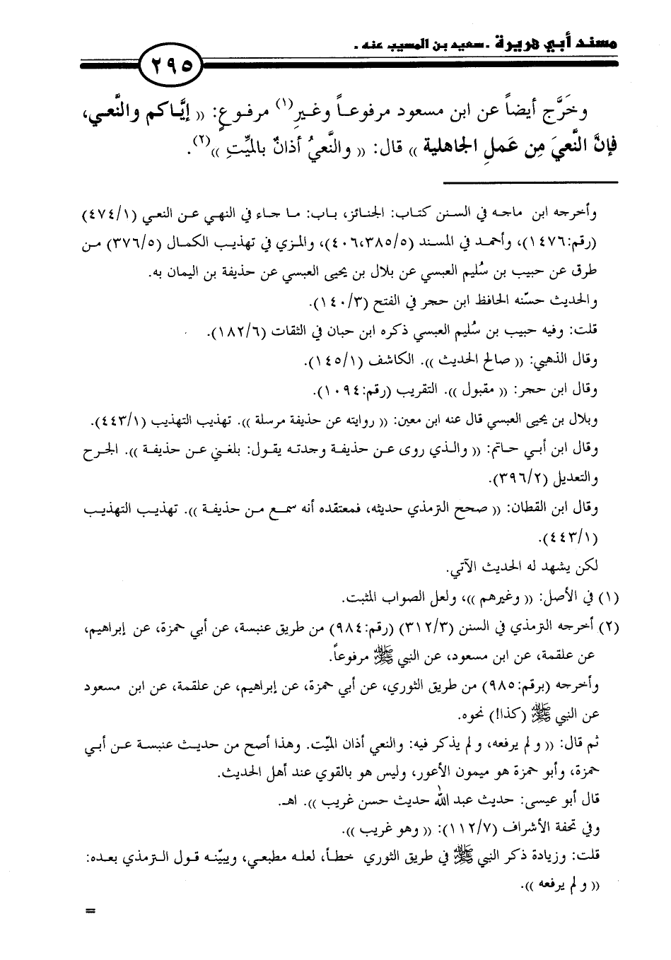 وخَرَّج أيضًا عن ابن مسعود مرفوعًا وغيرِ (١) مرفوعٍ: "إيَّاكم والنَّعي، فإنَّ النَّعيَ مِن عَملِ الجاهلية قال: "والنَّعيُ أذانٌ بالميِّتِ" (٢).