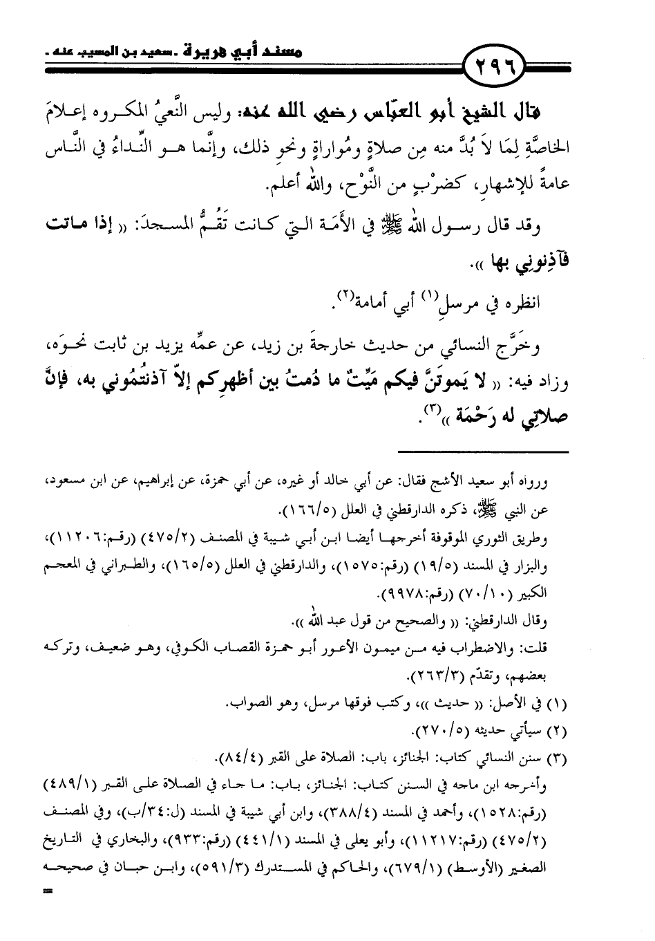 قال الشيخ أبو العبَّاس رضي الله عنه: وليس النَّعيُ المكروه إعلامَ الخاصَّةِ لِمَا لاَ بُدَّ منه مِن صلاةٍ ومُواراةٍ ونحوِ ذلك، وإنَّما هو النِّداءُ في النَّاس عامةً للإشهارِ، كضرْبٍ من النَّوْح، والله أعلم.