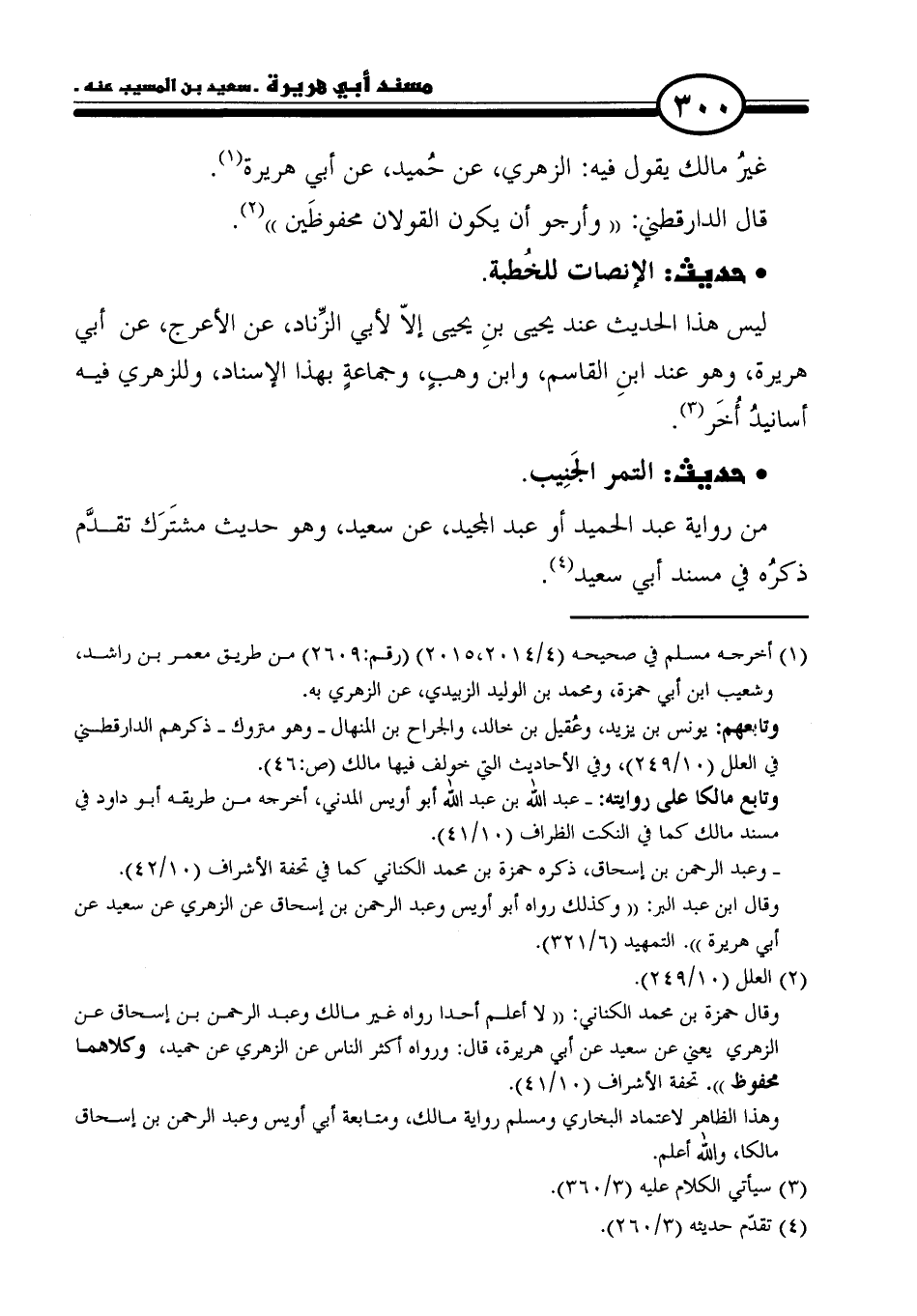 وقال حمزة بن محمد الكناني: "لا أعلم أحدا رواه غير مالك وعبد الرحمن بن إسحاق عن الزهري يعني عن سعيد عن أبي هريرة، قال: ورواه أكثر الناس عن الزهري عن حميد، وكلاهما محفوظ". تحفة الأشراف (١٠/ ٤١).
